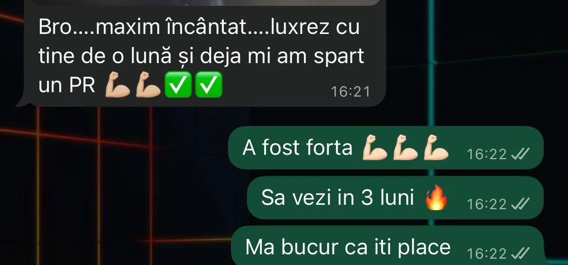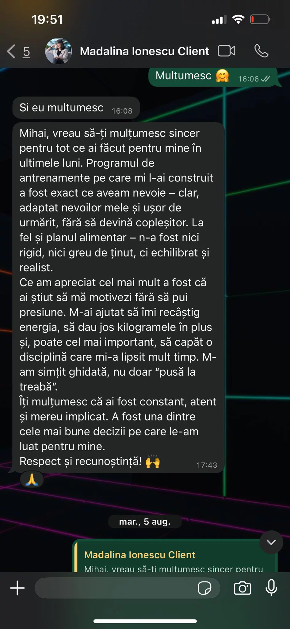 Tot ce voiam să îți spun este că sunt foarte mulțumită de colaborarea cu tine. Chiar simt că a fost una dintre cele mai bune alegeri și investiții pe care le-am făcut. Îmi place mult că spui lucrurile clar și realist, fără promisiuni inutile - așa am înțeles că rezultatele vin doar prin muncă, disciplină și motivație. Fără îndoială am reușit să îmi schimb complet stilul de viață, iar tu m-ai ajutat mult în tot acest proces. De una singură nu aș fi progresat atât. Îți mulțumesc mult!